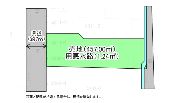 ・公簿売買(境界明示免責) ・自噴井戸あり ・解体後の更地渡し(井戸は埋め立予定なし) ・東側は水路があるため建築基準法上接道にはならないためセットバック不要です。なお無許可の橋が架かっています。(要相談) ・用悪水路(1.24㎡有) |
